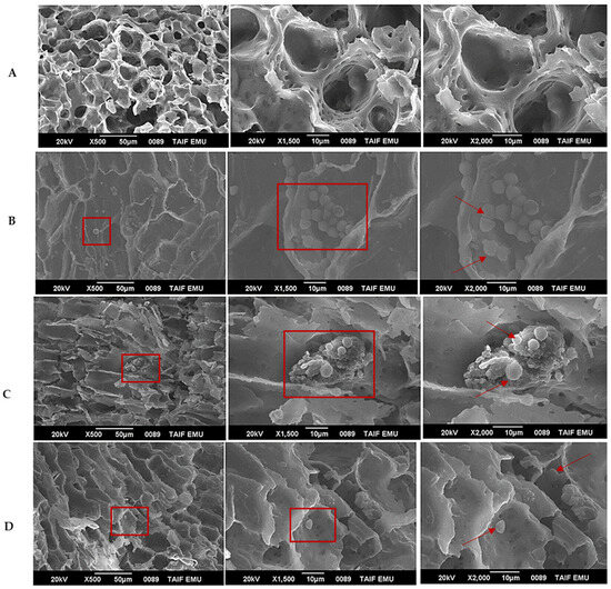 SEM images of nanoprimed Punica granatum seeds at various magnifications to visualize the adsorption of AgNPs. (A) Hydroprimed seeds (control) show no nanoparticles. (B–D) Seeds primed with different AgNPs: (B) AgNPs _PPE, (C) AgNPs_CE, and (D) AgNPs_ Chem. Red boxes and arrows highlight representative examples of adsorbed AgNPs on the seed coat surface at different magnifications (×500, ×1500, and ×2000).