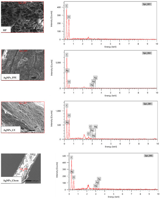 Scanning electron microscopy (SEM) revealed the presence of a porous structure on the surface of Punica granatum L. seeds [4,79]. This porous structure, inherent to lignocellulosic materials, likely arises due to the evaporation of volatile substances during seed coat formation [4,79]. These pores offer potential adsorption sites for mineral compounds, including AgNPs. Although SEM cannot visualize internal structures, it can be valuable for assessing particle purity and aggregation on the seed surface [80]. Previous studies have suggested that smaller nanoparticles exhibit higher surface energy, leading to increased interaction with cell walls [4,81,82]. This interaction could potentially lead to the development or expansion of existing pores, thereby enhancing the penetration of nanoparticles into the seed coat. The results of our energy-dispersive X-ray spectroscopy (EDX) analysis align with this hypothesis. Smaller AgNPs_Chem (62.68 nm) were detected in higher abundance within pomegranate seeds than larger AgNPs_CE (273.7 nm) and AgNPs_PPE (591 nm).