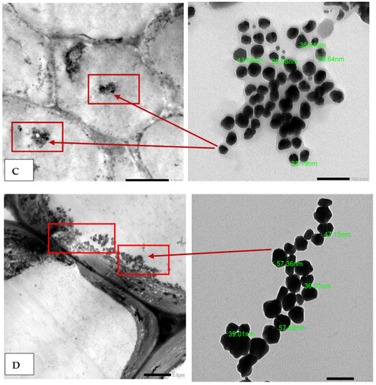 Transmission electron microscopy (TEM) was employed to investigate the potential translocation of AgNPs from the seed coat into the Punica granatum embryo. Figure 6A–D presents the TEM micrographs at various magnifications. In contrast to the absence of nanoparticles observed in hydroprimed control seeds (Figure 6A), TEM micrographs of nanoprimed seeds (Figure 6B–D) revealed the presence of electron-dense deposits within the embryo. These deposits appeared as individual dark particles and larger aggregates, suggesting the potential internalization of AgNPs, and higher magnification images (Figure 6C,D) provided further insight into the morphology of the internalized nanoparticles. The dark deposits exhibited a predominantly spherical or ellipsoidal shape, consistent with the expected morphology of AgNPs. These observations suggest the potential translocation of AgNPs from the seed coat to the Punica granatum embryo. The presence of individual particles and aggregates indicates that internalization may occur through various mechanisms.
