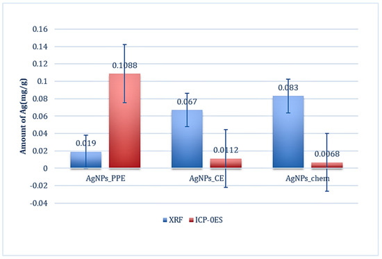 Measurements of the amount of AgNPs (mg/g) in P. granatum seeds subjected to AgNPs_PPE, AgNPs_ CE, and AgNPs_Chem using XRF and ICP-OES. The amount of Ag element is expressed as mean values derived from sample replications used for the investigation or mean ± SE.