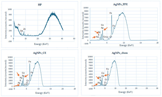 Analysis of P. granatum L. seeds treated with AgNPs_PPE and AgNPs_CE using X-ray fluorescence spectroscopy (XRF) compared with hydroprimed seeds (HP). Arrows indicate Ag signal in nanoprimed seeds.