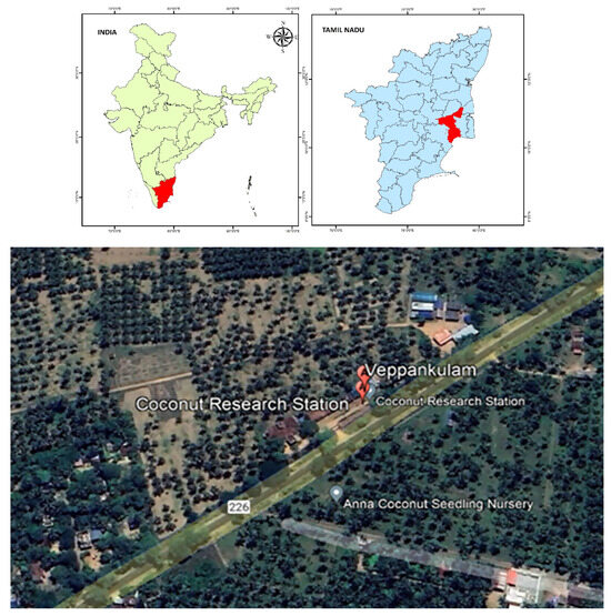 The research was carried out at the Coconut Research Station in Veppankulam, Tamil Nadu, India, over five years from 2016 to 2020. The study site is situated at around 10°29′ N latitude and 79°23′ E longitude, with an elevation of 20 m above sea level. The experiment was conducted on a 47-year-old coconut farm predominantly planted with the East Coast Tall coconut variety, with trees spaced at 7.5 m by 7.5 m intervals. The soil at the research site is sandy loam with moderate nitrogen and phosphorus levels, minor potassium levels and a pH ranging from 6.5 to 7.0. Furthermore, the area naturally receives an average annual rainfall of 1125 mm (Figure 1).