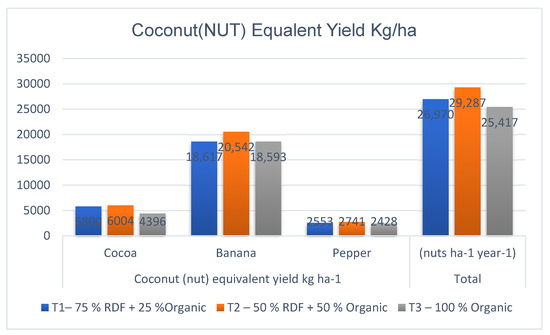 The crop (nut) equivalent yield of intercrops, as shown in Figure 3, significantly increase in T2, for cocoa (6004 nuts ha−1 year−1), banana (20,542 nuts ha−1 year−1) and pepper (2741 nuts ha−1 year−1). Following closely was T3, representing wholly organic nutrient management. The productivity of the intercropping system with coconut, measured in terms of coconut crop (nut) equivalent yield, showed a significant increase in T2—50% of recommended NPK + 50% of N concluded organic recycling with vermicompost + vermiwash + biofertilizer + in situ green manuring, reaching 29,287 nuts ha−1 year−1 [24].