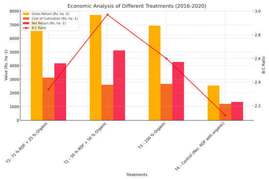 The important metrics to consider are gross return, cultivation cost, net return and benefit/cost (B/C) ratio. These metrics support our understanding of the profitability and efficiency of each treatment. In CBCS, four different treatments were evaluated over a period between 2016 and 2020. The economic outcomes of the INM treatment in the coconut-based cropping system are summarized in Table 5 and Figure 4.