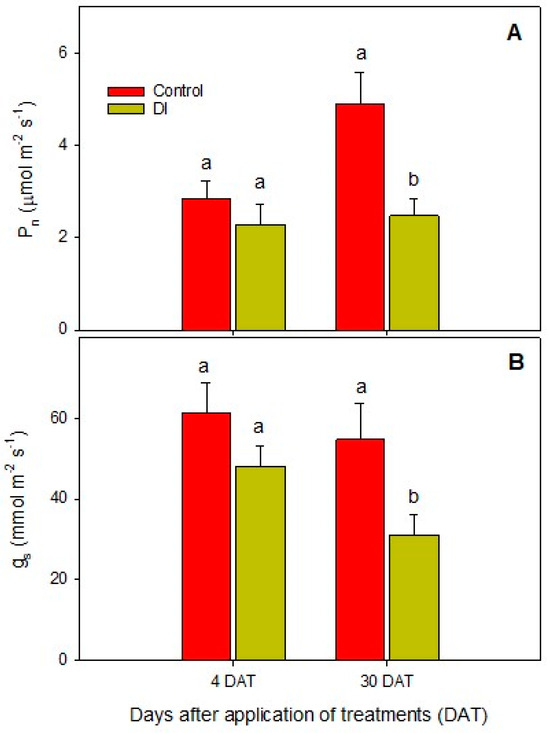 At 4 DAT, a non-significant reduction of 20% in the net photosynthetic rate and stomatal conductance was observed in the plants subjected to DI compared to the control treatment (Figure 2). At 30 DAT, the net photosynthetic rate values of the plants irrigated with DI decreased to half of those from the control treatment (Figure 2A), while the stomatal conductance decreased by 57%, showing statistical differences between the treatments (Figure 2B).