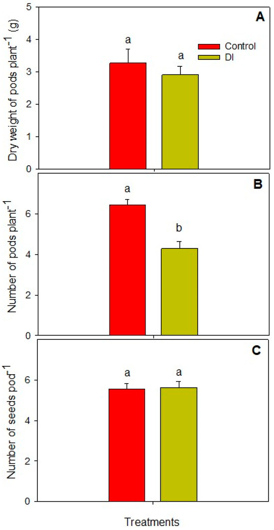 Dry weight of pods per plant (A), number of pods per plant (B), and number of seeds per pod (C) in bean plants irrigated through control and deficit irrigation treatments. Different lowercase letters indicate significant differences between treatments according to the Student’s t-test.