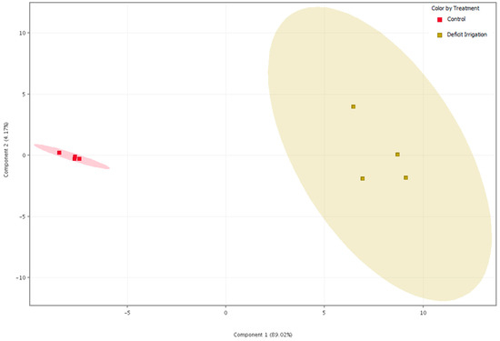 In order to find distinctive differences in the irrigation variable, a data matrix with two groups was created. The full data matrix was based on 1260 entities. A PLS-DA model was created to evaluate the classification of the samples into groups (Figure 4). The calculated PLS-DA model, based on 8 samples and 3 components, described 99.6% of the variance (R2 = 0.991) according to the cross-validation prediction of Q2 = 0.601. The first principal component, PC1, explained 89.02% of the total variability, demonstrating that the differences in the sample metabolomes might be affected by the irrigation. Additionally, the VIP (variable importance in projection) score was used to measure the importance of the entities, resulting in a filtered list of 179 entities according to a VIP > 1.