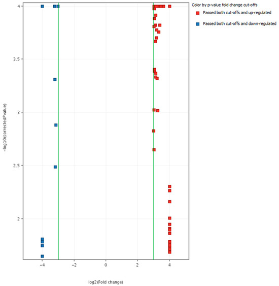 The univariate statistic layer was applied after the multivariate analysis. A total number of 179 metabolites were statistically significant (T-test unpaired; corrected p-value cut-off: 0.05; p-value computation: Asymptotic; Multiple Testing Correction: Benjamini-Hochberg) (Figure 5). The databases showed a list of 14 metabolites that were tentatively identified [27] unregulated between both treatments (Table 2). Among them, 12 new biomarkers (3–14, Table 1) were identified for the first time in beans under DI treatments. The metabolites tentatively identified belong mainly to the classes of dihydrofurans (1), hydroxybenzoic acids (2), polyphenols (3–6), lipids, and phospholipids (7–14). Among these 14 metabolites identified, two groups were clearly differentiated. As can be seen in Table 2, the metabolites 1–6 were upregulated, while 7–14 were identified as downregulated metabolites.