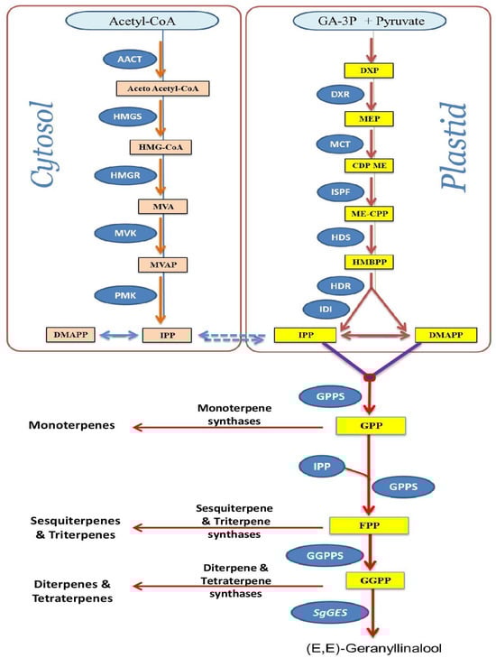 In recent years, EOs from Salvia species have emerged as a critical resource in pharmacological and aromatic research, focusing on the discovery and characterization of bioactive compounds. The essential oils derived from Salvia display significant bioactivities, including choleretic effects, antioxidant properties, antibacterial activity, anticancer properties, antimutagenic effects, and anti-inflammatory capabilities [,,]. Terpenoids have been classified as the largest class of secondary metabolites and natural products. They were detected in both plants and other species, with over 40,000 unique structural variations present [,,,,]. Isopentenyl diphosphate (IPP), which consists of five carbon atoms (C5), serves as the structural basis for terpenoid compounds; see Figure 1 [,]. The original names of these compounds were derived from the Pistacia terebinthus tree, which was the source from which all these unique terpene chemicals were first identified. Ruzicka and Wallach altered and depicted the structure of the terpene unit [,,,]. Certain terpenes play a vital role in the fundamental metabolic processes of plants and are indispensable for plant growth, flowering, and development. Examples of such terpenes include carotenoid pigments, the phytol side chains of chlorophyll, phytohormones, and certain constituents of cellular membranes [,]. Nonetheless, most terpenes that have been discovered are classified as secondary metabolites and are crucial to the way plants interact with their natural environments. Terpenes, both volatile and nonvolatile, are known to play a significant role in the defense against insects and microbes, as well as in the attraction of pollinators and the management of photo-oxidative stress []. To gain a comprehensive understanding of the functions of terpenes and terpenoid compounds, extensive research is currently being conducted [,,,,,]. Salvia species are widely recognized for their significant concentration of EOs, with mono- and sesquiterpenes constituting most of the constituents of their fragrant essential oils [,,,,,,,]. According to [], the primary sesquiterpenes in the Chinese cultivar of S. guaranitica are germacrene-A, isocaryophyllene, germacrene-C, humulene, caryophyllene, germacrene-D, pi-a-murolene, caryophyllene oxide, and d-cadinene. The pharmacological and physiological roles of these sesquiterpenes are diverse, and many of the genes responsible for synthesizing these compounds in Salvia are yet to be identified. In this study, the gene encoding the geranyllinalool synthase (SgGES, EC: 4.2.3.144) enzyme from S. guaranitica was cloned and subsequently subjected to functional characterization. Additionally, the recombinant SgGES catalyzed the conversion of geranylgeranyl diphosphate (GGPP) into a range of terpene products, including diterpenes in various forms.