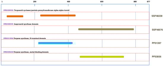 Putative domain analysis for SgGES using the InterPro protein sequence analysis and classification (https://www.ebi.ac.uk/interpro/ accessed on 10 July 2023) database. SgGES protein sequence has four protein family domains. Terpenoid cyclases/protein prenyltransferase alpha-alpha toroid domains (IPR008930/SSF48239, spanning from 35 to 133 and 235–440), an isoprenoid synthase domain (IPR008949/SSF48576, from 463 to 783), a terpene synthase N-terminal domain (IPR001906/PF01397, from 226 to 425), and a terpene synthase metal-binding domain (IPR005630/PF03936, from 466 to 727).