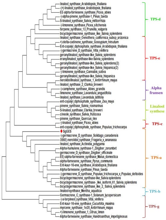 Phylogenetic tree of SgGES with selected terpene synthases from other plants. Seven previously identified TPS subfamilies (TPS-a to TPS-g) were chosen based on Bohlmann et al., 1998 and Ali et al., 2022 and 2021 [,,]. The alignment was performed using the PhyML server. The numbers indicated are the actual bootstrap values of the branches.