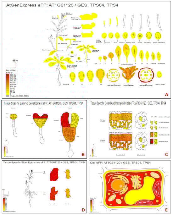 We performed a BlastP search against A. thaliana genomics with the Phytozome database (https://phytozome-next.jgi.doe.gov/, accessed on 16 June 2024) to monitor the putative tissue expression pattern of SgGES in A. thaliana with the nucleotide sequence of SgGES as a query. As a result, several nucleotides closely related to the SgGES sequences, especially (AT1G61120), with high BLAST identities % and e-values (73% and 5.81e-4) were identified. The tissue expression of the SgGES gene in Arabidopsis discovered by our data was analyzed across seventy-two tissues using the BAR database (http://bar.utoronto.ca/efp/cgi-bin/efpWeb.cgi, accessed on 16 June 2024) and the Arabidopsis Electronic Fluorescent Pictograph browsers (eFP browsers (http://bar.utoronto.ca/efp/cgi-bin/efpWeb.cgi, accessed on 16 June 2024) (Figure 4A–E). As demonstrated by the Arabidopsis eFP browsers, the SgGES gene (AT1G61120) was found in the majority of the tissues and was highly expressed in Flower Stage 15, Sepals (303.35), Flower Stage 15 (128.03), Rosette Leaf 4 (85.63), Flower Stage 12, Sepals (85.28), Leaf 7, Distal Half (58.53), Flower Stage 12 (49.55), and Rosette Leaf 6 (38.42).