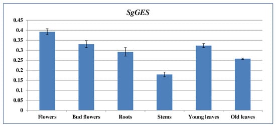 The transcripts of SgGES at various tissues of S. guaranitica (e.g., flowering buds, flowers, roots, stems, young and old leaves) were measured using qRT-PCR. The results revealed that flowers displayed the highest expression levels of all the tissues analyzed, followed by bud flowers, young leaves, roots, old leaves, and stems (Figure 5).