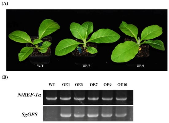 Overexpression of SgGES gene in transgenic N. tabacum. (A) Comparison of the phenotypes of the transgenic N. tabacum and wild-type N. tabacum. (B) Semiquantitative RT-PCR to confirm the expression of terpenoid genes.