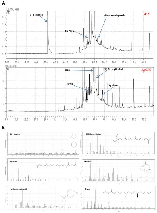 It was essential to analyze the metabolic profiles of tobacco plants after introducing the SgGES gene to identify the specific terpenes, and for this purpose, a GC-MS system was employed. The mono-, sesqui-, di-, and triterpene peaks were easily visible; the amount of each component was represented by the percentage of peak area (% peak area). To recognize those terpenes in our transgenic tobacco plants, the libraries of mass spectra from wild-type tobacco extracts were used as a reference. The data presented in Figure 7 and Table 2 unequivocally demonstrate a significant modification in the transgenic plants as a novel peak at the retention time of 50.461 was detected. This peak was identified as (E,E)-geranyllinalool based on the matched mass with the Wiley GC/MS Library, NIST Library, and VOC Analysis S/W software. On the other hand, the production of terpenes by the overexpression of terpene synthase genes in tobacco was described formerly by [,,]. Diverse terpene synthase genes have been identified as capable of producing multiple compounds simultaneously, such as carene, (±)-linalool, cineole, myrcene, β-amyrin, and terpinolene synthases [,,,,,,]. Based on our perspective, SgGES plays a pivotal part in the synthesis of (E,E)-geranyllinalool via the diterpenoid biosynthesis pathway, which is a prominent feature of diterpene biosynthesis processes.