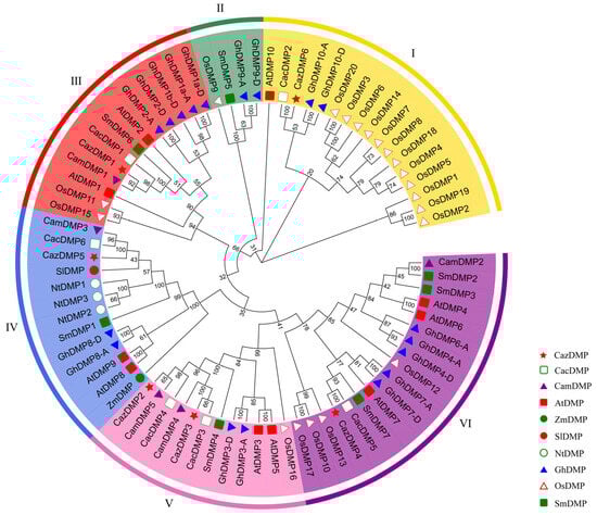Phylogenetic relationships of DMP genes from pepper (Caz; Cac; Cam), A. thaliana (At), Z. mays (Zm), S. lycopersicum (Sl), N. tabacum (Nt), G. hirsutum (Gh), S. melongena (Sm), and O. sativa (Os). The figures I to VI indicated that all DMP genes could be divided into six subfamilies.