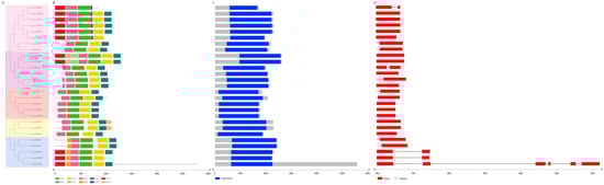 The Hidden Markov Model (HMM) profiles of the DMPs conservative domain (serial number PF05078) were downloaded from the Pfam database (http://pfam-legacy.xfam.org/, accessed on 12 March 2024) []. Subsequently, a search for the CaDMP genes were conducted from the pepper genome-wide database using the online tool Hmmer web search (the E-value was less than 1e-10) [], then SMART (http://smart.embl-heidelberg.de/, accessed on 12 March 2024) [] and Batch web CD-Search tools (https://www.ncbi.nlm.nih.gov/Structure/bwrpsb/bwrpsb.cgi, accessed on 12 March 2024) [] were used to screen and identify the domain of the obtained DMP genes, and finally the DMP candidate genes were identified.