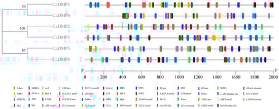 The analysis results of cis-acting elements of the DMP gene in pepper are shown in Figure 4 (the CaDMP in the following articles and pictures stands for CazDMP above). The DMP promoter region included many basic elements, such as photoresponse-related cis-acting element Box 4, MRE, 3-AF1 binding site, G-box, GT1-motif, low-temperature corresponding cis-acting element LTR, anaerobic induction-required cis-acting element ARE, cis-acting element involved in salicylic acid responsiveness as-1 element, and MYB binding site involved in drought-inducibility MBS, indicating that the DMP genes of pepper are involved in the hormone response, stress response, and other plant growth processes (Table S5).