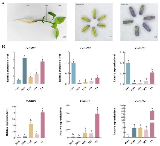 The relative expression levels of CaDMP genes in the root, stem, leaf, mononucleate anther, and trinucleate anther. (A) Different tissues of pepper, including the root, stem, leaf, mononucleate anther, and trinucleate anther; (B) the relative expression levels of CaDMP genes. “MA” represents mononucleate anther and “TA” represents trinucleate anther. Different lowercase letters on the bar indicate significant differences among treatments (p < 0.05).