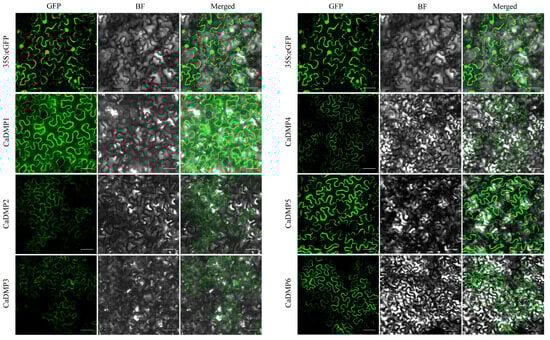 Subcellular localization of CaDMPs proteins in tobacco leaf. Scale bars: 40 μm.