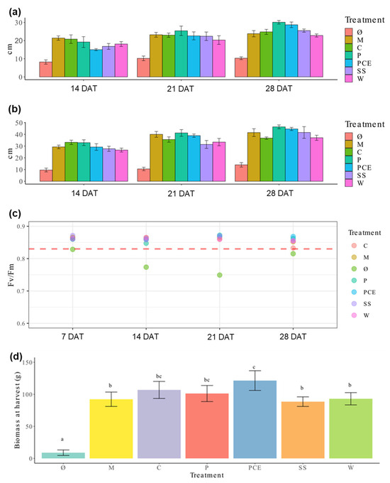 Graphs reporting the measurement collected during plant growth. (a) Height and (b) diameter of lettuce plants during the cultivation trial. Each cluster of bars represents the average measure of the treatments at 14, 21, and 28 days after transplant (DAT), respectively. (c) graph reporting the Fv/Fm ratio measured for each treatment at 7, 14, 21, and 28 DAT, respectively. Each dot represents the average measure of a treatment, as indicated by the color legend. (d) Fresh weight at harvest. Each bar represents the average measure of a treatment, with the error bars reporting standard deviation. Different letters above a bar (a, b, c) indicate statistically significant differences in the results according to a one-way ANOVA followed by a Tukey’s post hoc test (p < 0.05). Treatments are (1) Ø, non-fertilized treatment; (2) M, mineral fertilized treatment; (3) C, cow slurry digestate; (4) P, pig slurry digestate; (5) PCE, pig slurry, cow slurry and energy crop digestate; SS, sewage sludge; W, organic fraction of municipal solid waste.