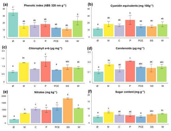 Graphs reporting the characterization of molecules in the lettuce at harvest: (a) phenolic compounds, reported as absorbance at 320 nm per gram; (b) anthocyanins, reported as cyanidin equivalents; (c) chlorophyll a + b, reported as µg mg−1; (d) carotenoids, reported as µg mg−1; (e) nitrates, reported as mg kg−1; (f) sugar content, reported as mg g−1. Each bar represents the average measure of a treatment, with the error bars reporting standard deviation. Different letters above a bar (a, b, c, d) indicate statistically significant differences in the results according to a one-way ANOVA followed by a Tukey’s post hoc test (p < 0.05). Treatments are (1) Ø, non-fertilized treatment; (2) M, mineral fertilized treatment; (3) C, Cow slurry digestate; (4) P, Pig slurry digestate; (5) PCE, Pig slurry, Cow slurry and Energy Crop digestate; SS, Sewage Sludge; W, organic fraction of municipal solid Waste.