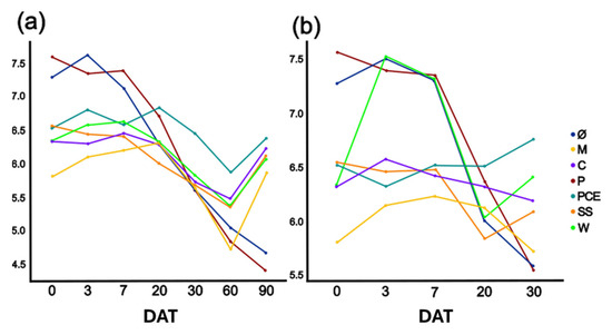 Graphs reporting the pH evolution in the (a) unplanted or (b) planted pots. The X-axis reports the days after transplant (DAT), while the Y-axis reports the pH value in the substrates. Each color represents a different treatment, as reported in the legend. Treatments are (1) Ø, non-fertilized treatment; (2) M, mineral fertilized treatment; (3) C, cow slurry digestate; (4) P, pig slurry digestate; (5) PCE, pig slurry, cow slurry and energy crop digestate; SS, sewage sludge; W, organic fraction of municipal solid waste.