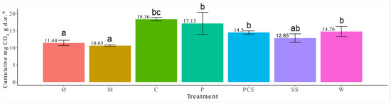 Graph reporting the respiration of the substrates. Each bar represents a different treatment, and the height of the bar represents the cumulative mg of CO2 per gram of substrates. The numbers on top of the bars report the average value for each treatment. Different letters above a bar (a, b, c) indicate statistically significant differences in the results according to a one-way ANOVA followed by a Tukey’s post hoc test (p < 0.05). Treatments are (1) Ø, non-fertilized treatment; (2) M, mineral fertilized treatment; (3) C, cow slurry digestate; (4) P, pig slurry digestate; (5) PCE, pig slurry, cow slurry and energy crop digestate; SS, sewage sludge; W, organic fraction of municipal solid waste.