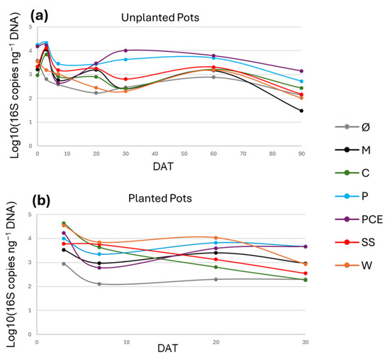 Graphs reporting the 16S gene copy number during the trial in (a) unplanted and (b) planted pots. In the graphs, the X-axis reports the days after transplant (DAT), and the Y-axis reports the 16S gene copy numbers, expressed in logarithmic scale of 16S copy number normalized on the ng of DNA of the samples. Each line represents a different treatment, as reported in the legend. Treatments are (1) Ø, non-fertilized treatment; (2) M, mineral fertilized treatment; (3) C, cow slurry digestate; (4) P, pig slurry digestate; (5) PCE, pig slurry, cow slurry and energy crop digestate; SS, sewage sludge; W, organic fraction of municipal solid waste.