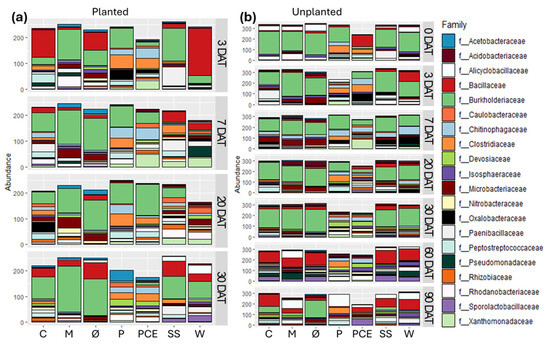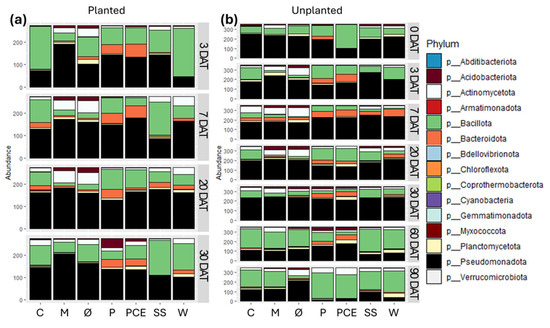 Stacked bar graphs reporting the abundance of different bacterial families in the substrate samples coming from (a) planted and (b) unplanted pots. In each graph, the X-axis reports the different treatments, while the Y-axis reports the abundance of bacterial 16S reads, with samples rarefied to the same depth. Each row in the graphs reports the data for a single time point, as indicated on the right side of the row. Each color in the bars indicates a different bacterial phylum, as reported in the legend. The graphs report only the 20 most abundance families found in the dataset, empty space between the end of the bar and the top of the graph is the quantity of reads not included in these 20 families. Treatments are (1) Ø, non-fertilized treatment; (2) M, mineral fertilized treatment; (3) C, cow slurry digestate; (4) P, pig slurry digestate; (5) PCE, pig slurry, cow slurry and energy crop digestate; SS, sewage sludge; W, organic fraction of municipal solid waste.