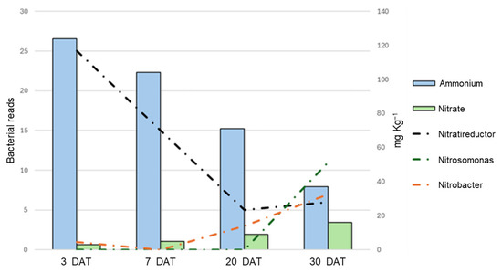 Graphs comparing the abundance of specific nitrogen-cycle-associated bacterial genera with the evolution of nitrogen in the substrate. The X-axis reports the different time points, the main Y-axis reports the abundance of chosen bacterial 16S reads, while the secondary Y-axis reports the concentration of ammonium/nitrate. The bars of different colors report the abundance of ammonium and nitrate, while the dashed lines of different colors report the abundance of the bacterial reads, as indicated in the legend.