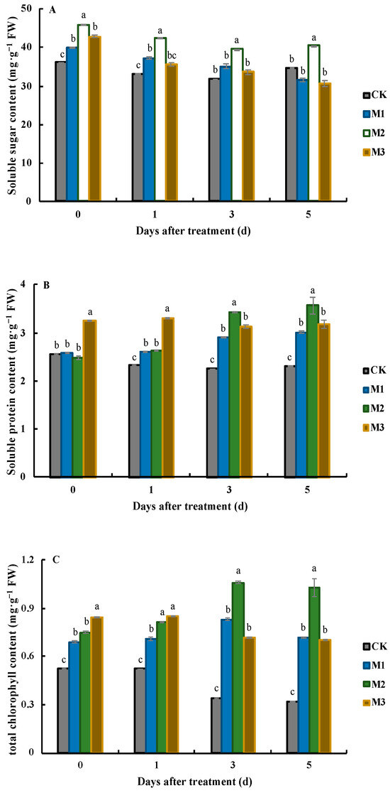 Effects of MeJA application on soluble sugar (A), soluble protein (B), and total chlorophyll (C) at different days after treatment. Values represent the mean ± SD, and different lowercase letters indicate significant differences at the 0.05 level.