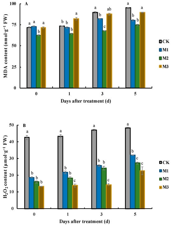 Effects of MeJA application on MDA (A) and H2O2 (B) on different days after treatment. Values represent the mean ± SD, and different lowercase letters indicate significant differences at the 0.05 level.