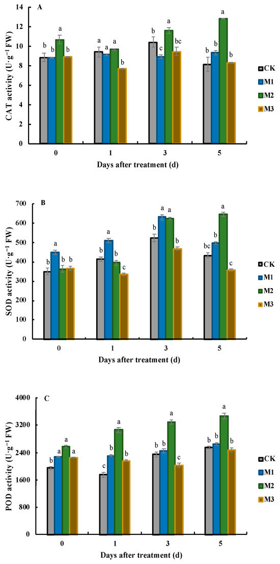 It was found that the CAT activity in the leaves of the M2 treatment was the highest at all sampling times (Figure 3A). During the first sampling period, the CAT activity in the leaves of the M2 treatment reached 10.7 U·g−1 FW, which was 1.21, 1.21, and 1.20 times higher than that in the leaves of the CK, M1, and M3, respectively. There were no significant differences in CAT activity between these three treatments. After that, the CAT activity in the leaves of the M2 and M3 treatments decreased, while the CAT activity in the CK and M1 leaves slightly increased. At this time, the CAT activity was the highest in the M2 treatment (9.68 U·g−1 FW) and the lowest in the M3 treatment (7.69 U·g−1 FW). At 3 DAT, the CAT activity in the leaves of the M1 treatment dropped to the lowest level, at 8.95 U·g−1 FW, which was not significantly different from the CAT activity in the leaves of the M3 treatment (9.47 U·g−1 FW), but was significantly lower than that in the leaves of the CK and M2 treatment (10.4 U·g−1 FW and 11.6 U·g−1 FW, respectively). During the last sampling period, the CAT activity in the leaves of the M2 treatment continued to increase and was significantly higher than that in the leaves treated with the other three treatments. At this time, the CAT activity in the CK leaves was only 8.15 U·g−1 FW.