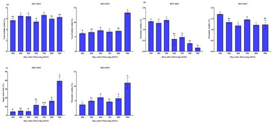 Dynamic changes in mango fruit pulp during 2021–2022 and 2022–2023, respectively. The graphs illustrate the following parameters: (a) TSS, (b) TA, and (c) TSS/TA. Different letters indicate significant differences during the growth periods (p ≤ 0.05).