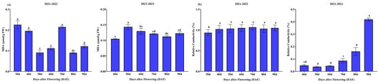 Dynamic changes in mango fruit pulp during 2021–2022 and 2022–2023. The graphs illustrate the following parameters: (a) MDA and (b) RC. Different letters indicate significant differences during the growth periods (p ≤ 0.05).