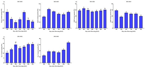 Dynamic changes in mango fruit pulp during 2021–2022 and 2022–2023. The graphs illustrate the following parameters: (a) H2O2, (b) O2−, and (c) OH− contents. Different letters indicate significant differences during the growth periods (p ≤ 0.05).