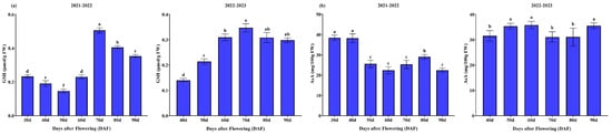 The variations in reactive oxygen species ROS levels within mango pulp over two consecutive years are depicted in Figure 3a–c. During the period of (2021–2022), there was a fluctuating pattern in the hydrogen peroxide (H2O2) content, with an initial decrease followed by a subsequent rise from 30 to 70 DAF, then decreased at later stages. Conversely, in the following year (2022–2023), the H2O2 content fluctuated from 40 to 90 DAF. Throughout (2021–2022), the hydroxyl radical (OH−) content fluctuated between 30 and 50 DAF, and remained stable afterwards. Conversely, in the following period from (2022–2023), OH− content showed a significant difference between 40 and 80 DAF and then decreased later. Furthermore, the superoxide anion (O2−) content observed a distinct upward trend during both years.