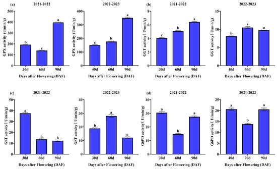 Dynamic changes in the enzymatic activity of GSH; mango fruit pulp during 2021–2022 and 2022–2023. The graphs illustrate the following parameters: (a) Glutathione peroxidase (GPX), (b) gamma-glutamyl transferase (GGT), (c) glutathione transferases (GST), and (d) glucose-6-phosphate dehydrogenase (G6PD). Different letters indicate significant differences during the growth periods (p ≤ 0.05).