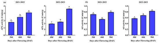 Dynamic changes in the enzymatic activity of mango fruit pulp during 2021–2022 and 2022–2023. The graphs illustrate the following parameters: (a) APX and (b) AO. Different letters indicate significant differences during growth (p ≤ 0.05).