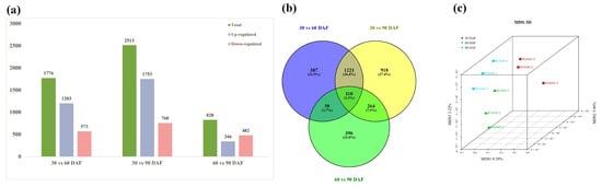 (a) Bar plot of DEGs from the comparisons of 30 vs. 60 DAF, 30 vs. 90 DAF, and 60 vs. 90 DAF. (b) Venn diagrams illustrate commonly expressed genes across comparisons of 30 vs. 60 DAF, 30 vs. 90 DAF, and 60 vs. 90 DAF. (c) This figure presents a Multidimensional Scaling (MDS) analysis. The dots of different colors and shapes represent different samples of specimens. The scales of the horizontal and vertical coordinates reflect the relative distances between the samples.