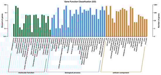 GO annotated classification histogram of differential genes. The results were summarized in three main categories: biological process, cellular component, and molecular function. The horizontal axis is the functional classification, and the vertical axis is the number of genes in the classification (right) and their percentage of the total number of genes on the annotation (left).