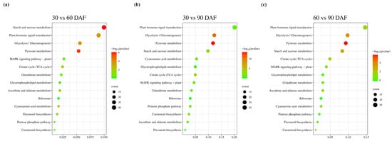 Encyclopedia of genes and genomes (KEGG) enrichment analysis of DEGs in mango. (a) KEGG enrichment pathways of 30 vs. 60 DAF, (b) KEGG enrichment pathways of 30 vs. 90 DAF, (c) KEGG enrichment pathways of 60 vs. 90 DAF. The y-axis indicates the KEGG metabolic pathway. The x-axis indicates the number of genes annotated to the pathway.