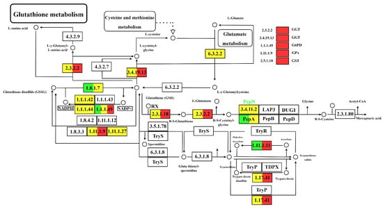 KEGG metabolic pathway illustrates the differentially expressed genes involved in the glutathione (GSH) metabolism pathway. In this diagram, the relative expression levels were indicated by distinct colours. Upregulated genes are represented in red, with a deeper red colour indicating a higher level of upregulation. Conversely, down-regulated genes are shown in green, with a deeper green colour indicating a higher level of downregulation. Non-differentially expressed genes are marked in yellow, signifying no significant change in expression levels between the samples.
