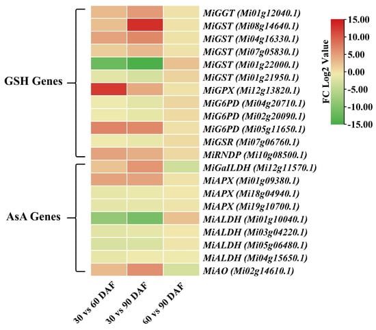 Differential gene heatmap based on log2 (fold change) depict gene expression patterns and comparisons in GSH and AsA metabolism pathways, offering insights into mango response to dynamic changes over time. Each row represents a gene, and each column represents a comparison group, red indicates upregulated expression, and green indicates downregulated expression.