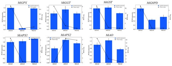 To validate the expression profiles of genes related to GSH and AsA metabolism that were identified through RNA-Seq, we analyzed the expression levels of 7 specific genes using qRT-PCR as shown in Figure 13. The genes that were examined include MiGPX, MiGGT, MiGST, MiG6PD, MiAPX1, MiAPX2, and MiAO. The results obtained from qRT-PCR generally aligned with the data from RNA-Seq, which were measured in fragments per kilobase per million reads (FPKM). Statistical analysis revealed similar differential expression patterns in both qRT-PCR and RNA-Seq datasets (Supplementary Figure S1, [39]).