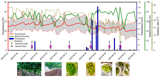 Climatological data collected by the IVIA weather station located in Monforte del Cid-Alicante (Spain) from 1 June to 30 September 2024. Dates of treatment application and cluster harvesting.