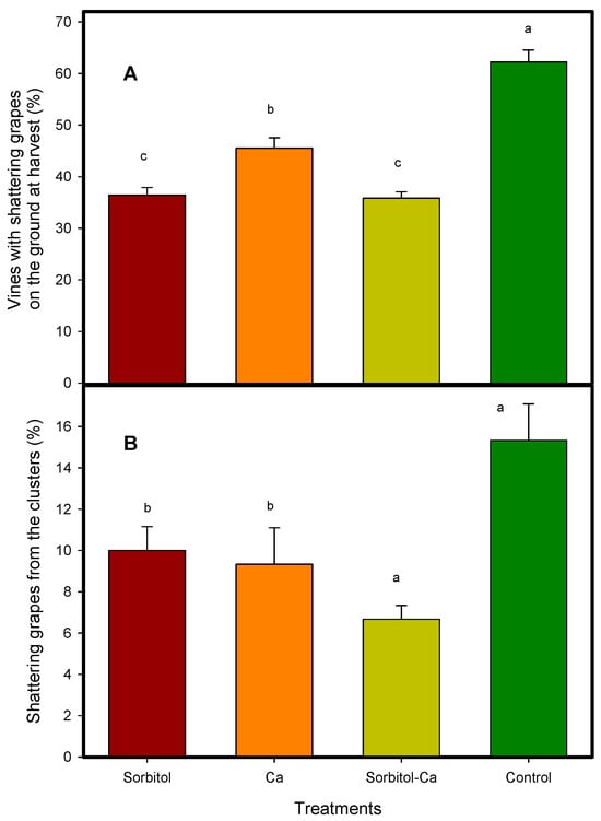 In this context, 62.26 ± 2.30% of control vines showed detached berries on the ground at harvest (Figure 2A). However, the percentage of vines with berries detached on the ground was significantly lower (p < 0.001) for those treated with sorbitol (34.41 ± 1.5%), Ca (45.50 ± 2.01%), or sorbitol–Ca (35.85 ± 1.20%). In previous years, 2021 and 2022, during August and September, these climatic conditions did not occur; there was no precipitation before harvest, temperatures were more stable, and average relative humidity was below 70%. Consequently, shattering in these vineyards was less severe. Bassiony et al. [48] confirm that calcium applications in the form of Ca reduced cluster shattering at harvest.
