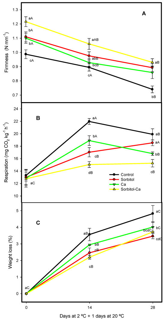 Firmness (N mm−1) (A), respiration rate (mg CO2 kg−1 h−1) (B) and weight loss (%) (C) of table grape treated with sorbitol (red), Ca (green), sorbitol–Ca (yellow), and control (black) during storage at 2 °C plus 1 day at 20 °C. Data are the mean ± SE of three samples for each replicate and treatment. Different lowercase letters indicate significant differences between treatments on the same sampling day, and different uppercase letters indicate significant differences between samples of the same treatment on different storage days.