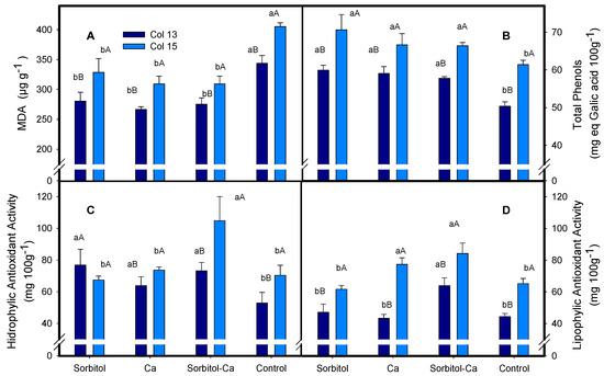 MDA (µg g−1) (A), total phenols (mg Gallic acid 100g−1) (B), hydrophilic antioxidant activity (mg 100g−1) (C) and lipophylic antioxidant activity (mg 100g−1) (D) in table grape treated with sorbitol, Ca, sorbitol–Ca and control at harvest and the end of storage. Data are the mean ± SE of three samples for each replicate and treatment. Different lowercase letters indicate significant differences between treatments on the same sampling day, and different uppercase letters indicate significant differences between samples of the same treatment on different storage days.